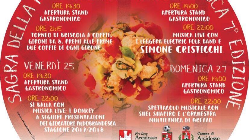 Questa sera dunque il primo appuntamento è alle 19 e 30 con l’apertura dello stand, alle 21 e 15 si svolgerà il tradizionale torneo di briscola a coppie, gironi da 8. Venerdì si ballerà con la musica live: I Donkey e a seguire la presentazione dei giocatori Aldobrandesca. Sabato l’appuntamento musicale sarà con il live dei Leggera Electric Folk band accompagnati da Simone Cristicchi e domenica 27 lo spettacolo musicale dei Shel Shapiro e l’orchestra multietnica di Arezzo concluderà la karmesse gastronomica e musicale.