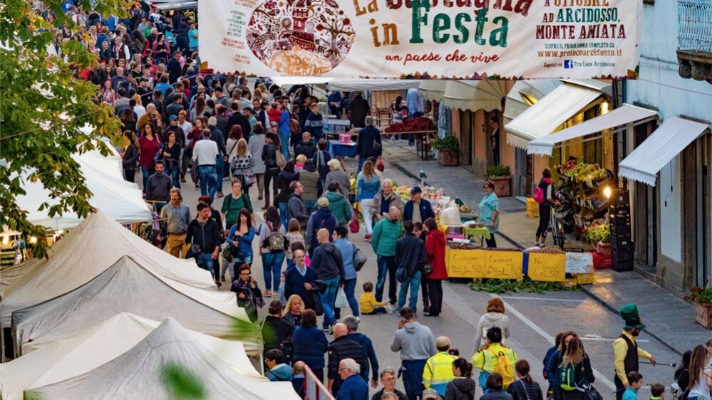 Ad Arcidosso, sul Monte Amiata, è tutto pronto per una nuova edizione – la 37esima – de La Castagna in Festa. In programma due weekend ricchi di iniziative. Si parte venerdì 14 fino a domenica 16 ottobre e poi la festa ritorna dal 21 al 23 ottobre e in programma ci sono molti appuntamenti, tutti da vivere. Protagoniste sono, di nuovo, le cantine dislocate nel centro storico del paese amiatino. Ogni angolo offrirà piatti tipici a base di prodotti locali, negli angoli delle strade saranno presenti i “Caldarrostai” che con grandi padelle cuoceranno ottime caldarroste, da gustare insieme al vin brulè. In alto spicca la possente Rocca Aldobrandesca e nei giorni di festa sarà possibili visitarla, scoprendo le raccolte di arte e i musei che si trovano al suo interno. Festa della Castagna è anche sinonimo di attività outdoor, mercatini e concerti, questi ultimi si svilupperanno siano nelle strette vie del centro che in nelle piazze principali del paese.