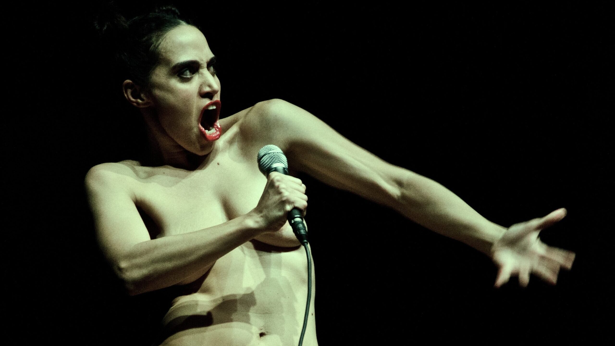“Si deve ridere. È una tragedia in tre tempi: Le Cosce, Il Cazzo, La Fama e un controtempo: L’Italia. Nella sua nudità e intimità pubblica, l’attrice costruisce una maschera fisica/vocale sfidando un testo scandaloso, provocatorio e rabbioso.