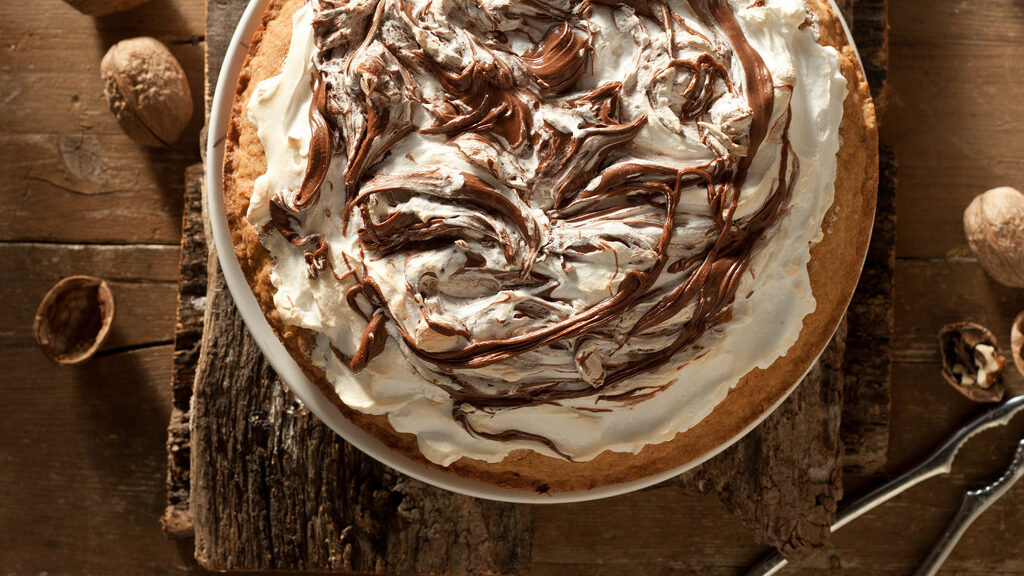 Dopo aver sfornato e fatto raffreddare la torta coprirla con la chiara montata a neve insieme allo zucchero e infine guarnire con qualche goccia di cioccolata liquida. Rimettere in forno a 200° per un minuto fino a far ammorbidire la meringa che non si deve seccare.