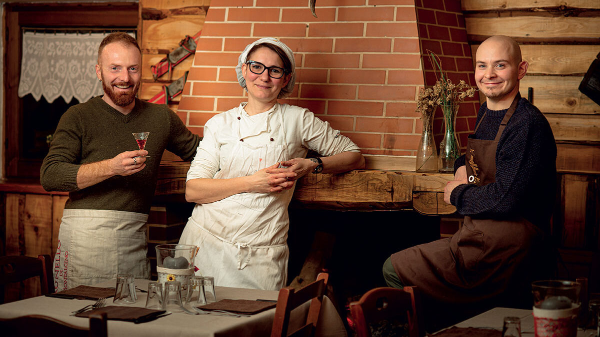 L’atmosfera è calda e allegra, anche quando all’esterno infuria la tormenta di neve. Un tepore dato, oltreché dal caminetto, sempre acceso, da Clara, Alessio e Mattia: insieme hanno scelto questa baita sul monte Amiata – tra una faggeta e una pista da sci – per realizzare il sogno di aprire un ristorante in alta quota (a 1.450 metri sul livello del mare).
