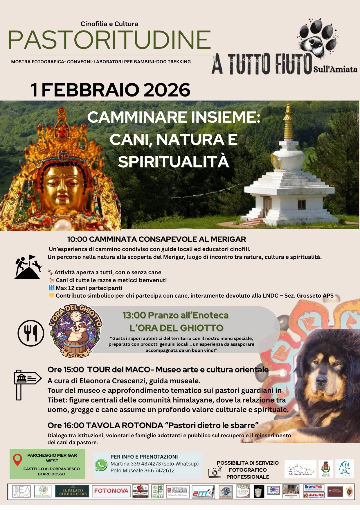 Il programma prosegue domenica 1 febbraio, con una mattinata all’insegna della natura e del benessere. Alle ore 10 è previsto un dog trekking a Merigar, sede della comunità tibetana laica Dzogchen, luogo immerso nel verde e carico di spiritualità. La passeggiata è aperta a tutti e si può partecipare con o senza il proprio cane.