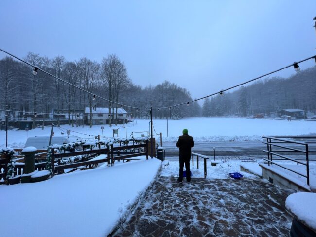 Neve nella notte sul Monte Amiata. Bellissima ma ancora insufficiente per garantire l’apertura degli impianti.