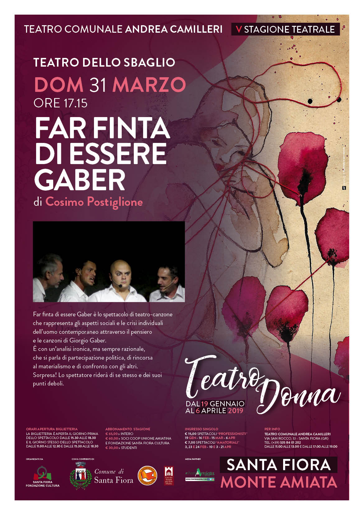 Domenica, alle 17.15 il penultimo appuntamento della stagione teatrale “Teatro Donna” . Sul palcoscenico del teatro di Santa Fiora la compagnia “Teatro dello Sbaglio” porterà lo spettacolo “Far finta di essere Gaber”.