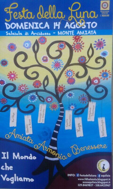 Una serie di curve a gomito accompagnano il visitatore alla scoperta di questo tanto sperduto quanto incantevole borgo amiatino. A metà strada tra Arcidosso e Monticello Amiata, ai piedi del Monte Aquilaia, nasce Salaiola, piccolo centro immerso nella natura amiatina. Il borgo che è una una grande terrazza dalla quale si scorgono incantevoli panorami ha la straordinaria forza di mantenere in vita l’importante tradizione della parola scritta. Le pareti esterne delle abitazioni ospitano i più famosi “versi” scritti dei più grandi scrittori. Ma oltre a questo progetto Salaiola ospita un’altra importante festa, giunta alla tredicesima edizione e che mai ha perso di vista l’obiettivo di essere originale. Quest’anno la “Festa della Luna” si svolgerà domenica 14 agosto e si concentrerà sul “Mondo che vogliamo”. “Sarà un incontro di idee, culture, prospettive, proposte e discipline – fanno sapere gli organizzatori – Sarà uno scambio tra persone che immaginano una terra diversa, dove tutti gli esseri viventi abbiano il diritto di dire “Questo è il mondo che vogliamo”. Importante sarà trasmettere benessere ecco dunque la possibilità di dimostrazioni di Tuina, Riflessologia plantare, Ku-Nye, Massaggio sonoro con didjeridoo, Massaggio sonoro campane tibetane, Reiki, Tarocchi, Aura Soma, Rune e Shatsu, Consulenza Naturopatica, Fiori di Bach, Canti Armonici, Yoga, Yoga e Movimento, Feldenkrais.