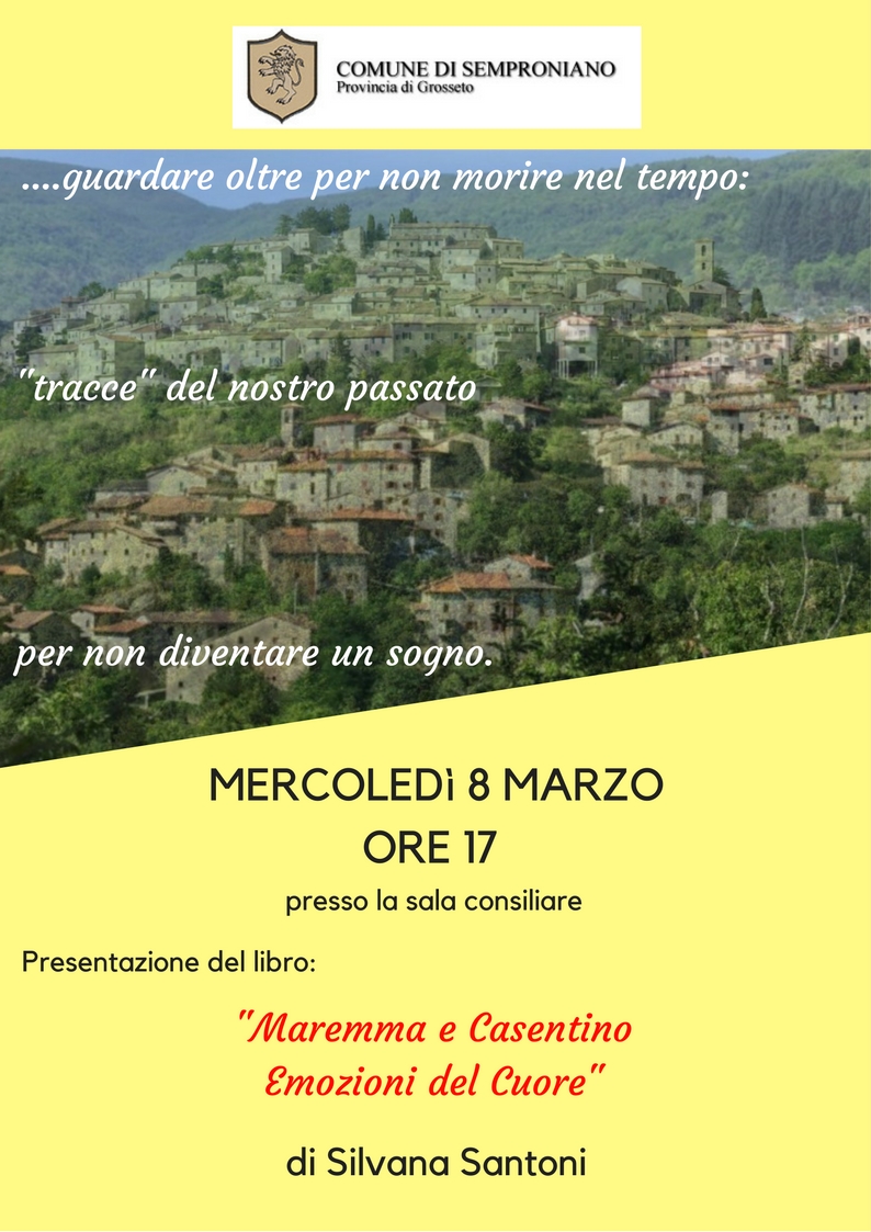 Anche a Semproniano la donna è al centro di un importante evento organizzato dal comune di Semproniano. Sarà presentato mercoledì 8 marzo il libro dal titolo “Maremma e Casentino, emozioni nel cuore” scritto da Silvana Santoni. L’incontro, che si svolgerà in sala consiliare a Semproniano a partire dalle 17, vedrà l’intervento anche del primo cittadino, Miranda Brugi da sempre al fianco delle donne.