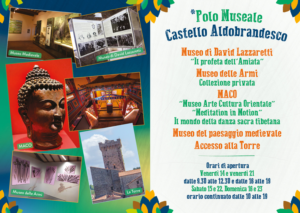 Il polo museale di Arcidosso offre molte occasioni di scoperta, dal Museo di David Lazzaretti “Il profeta dell’Amiata” , al Museo delle Armi – Collezione privata, al MACO “Museo Arte Cultura Orientale” e la “Meditatio in Motion”, il mondo della danza sacra tibetana. Un’occasione unica anche per accedere alla Torre del castello.