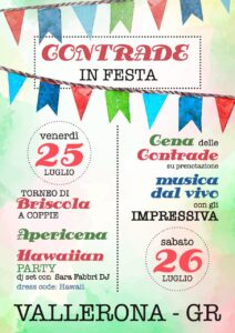 A Vallerona, venerdì 25 e sabato 26 luglio torna una nuova edizione di “Contrade in Festa”, una due giorni dove cibo, musica e tradizioni si incontrano per un’esplosione di gioia e divertimento.