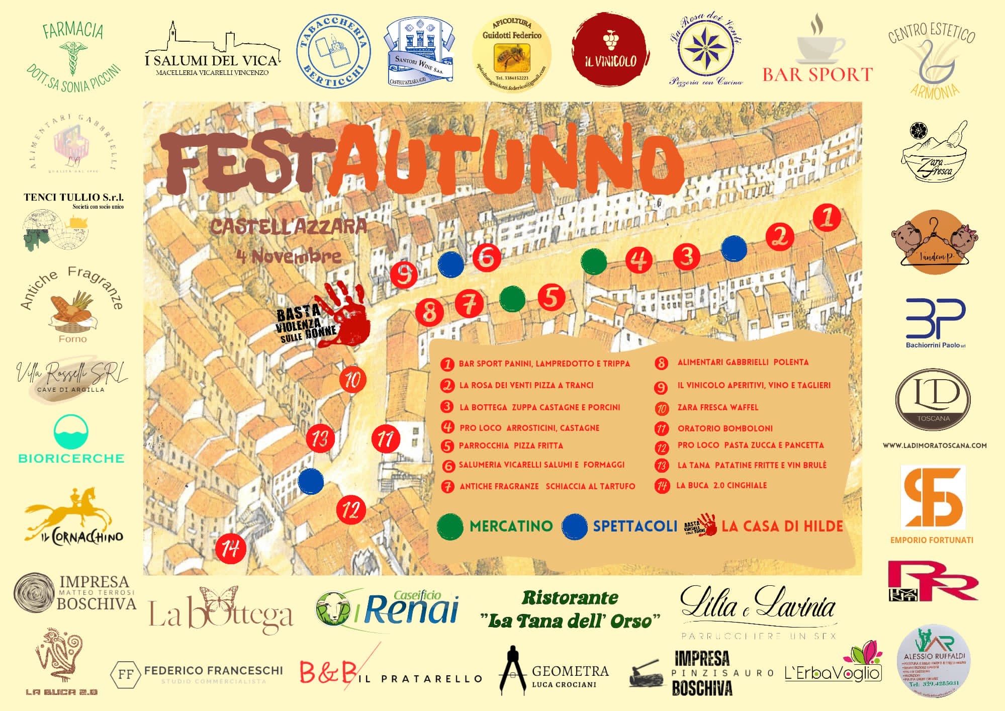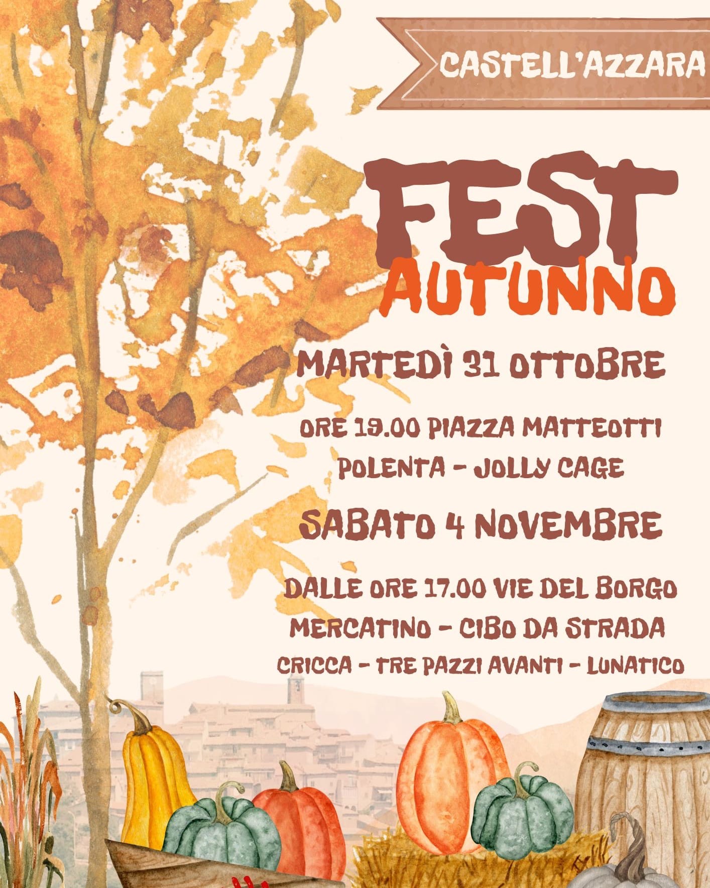 Martedì 31 ottobre e sabato 4 novembre è di scena Fest Autunno, due giorni di degustazioni, musica e divertimento. Tante attività in programma. Il 31 ottobre dalle 19 polenta in piazza Matteotti a seguire castagne, vino novello e musica dal vivo. il 4 novembre dalle ore 17 nella via centrale del paese mercatino artigianale e trucca bimbi in piazza matteotti tutto accompagnato dalla performance della street band ” la racchia ” 50 elementi. a seguire apertura di 14 fraschette che saranno gestite dalla pro loco, attività commerciali e associazioni. durante la serata musica dal vivo e tanto divertimento. Dal 31 ottobre al 5 novembre a Castell’Azzara si svolgerà la mostra “geometrie senza tempo” de “La casa di Hilde” di Piancastagnaio. Figure colorate e luminose contro la violenza sulle donne.